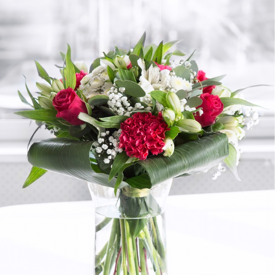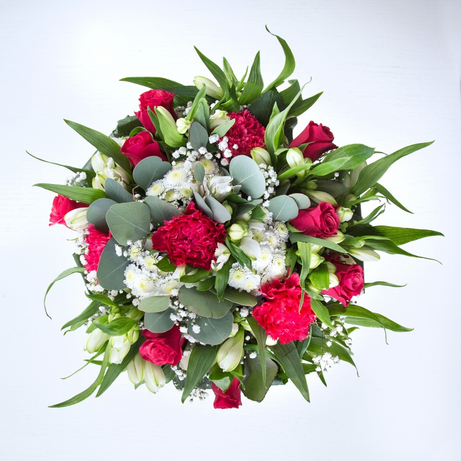 Our elegant bouquet is a perfect blend of vibrant red roses and pure white chrysanthemums, enriched with gypsophila and complemented by white alstroemeria and lush aspidistra leaves. Each flower is meticulously hand-selected to ensure exceptional freshness and long-lasting beauty.