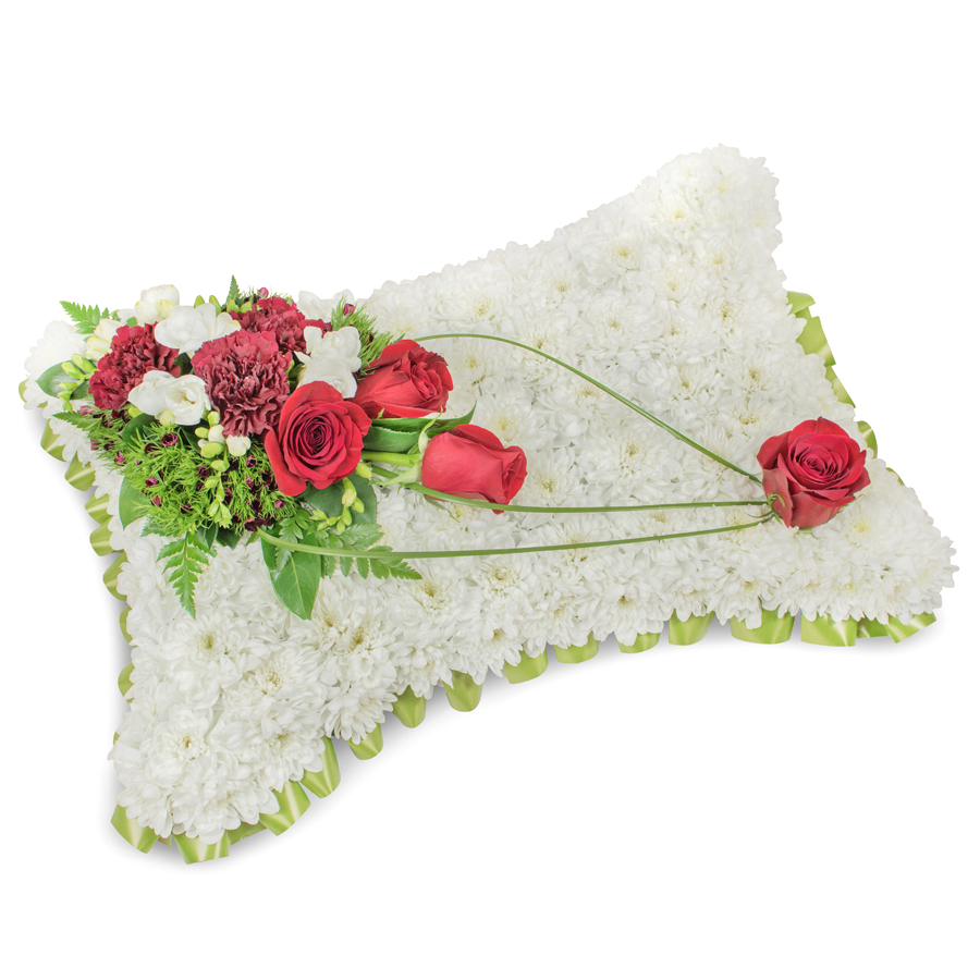 Express your deepest condolences with our classic sympathy arrangement, featuring a timeless selection of white chrysanthemums, red roses, white freesias, dark red carnations, dianthus, and bear grass. Each flower is hand-picked to ensure utmost freshness and elegance.